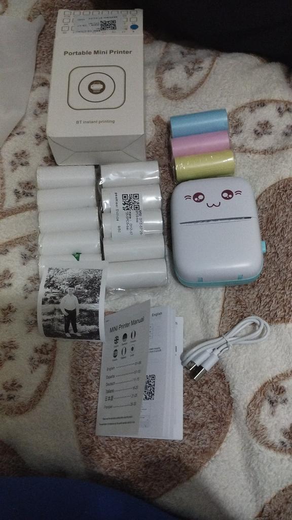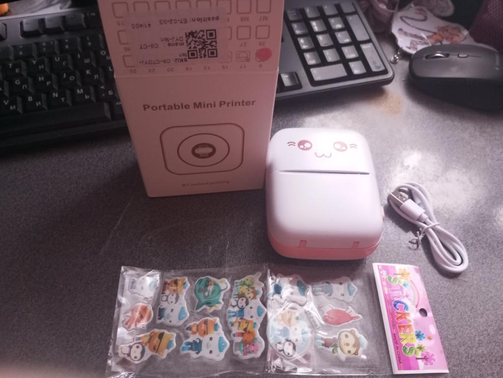 Inside there is an English manual on how to use the device and instructions on how to insert the paper correctly. There is also a QR code to download the app. Just scan, download, install. A big plus of the application is that it automatically turns on the language of the phone interface. Therefore, everything is immediately clear) Print quality is normal. The text prints better, the photo is a little worse (blurred). Well, this is expected in principle))) There is a roll of paper inside. Also included is a Type-C cord, without a charger (you should keep this in mind). The printer is connected to the phone once. The next time, you just need to turn on the printer, go to the application and print (the device is saved). Connects very quickly. Stickers were added as a gift.