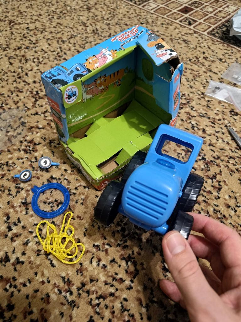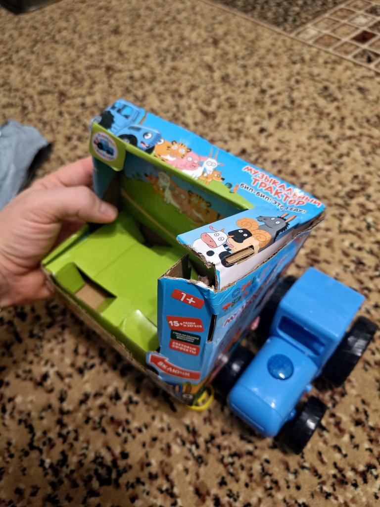 The packaging is trashed, the toy is definitely not for a gift...also there is no sticker with the tractor's smile...
