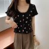 Retro Knit Short-sleeved T-shirt Female Summer Gentle Slim Small Flowers Navel Exposed Tops Casual Essential Comfort Style Slim Fit Pullovers Tees