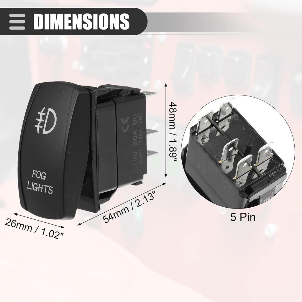 Motoforti Universal Fog Lights, 5 Pin Toggle Rocker SPST Switch Laser ON/OFF Button, 20A/12V 10A/24V, Waterproof for Car, Plastic, White LED Lighted