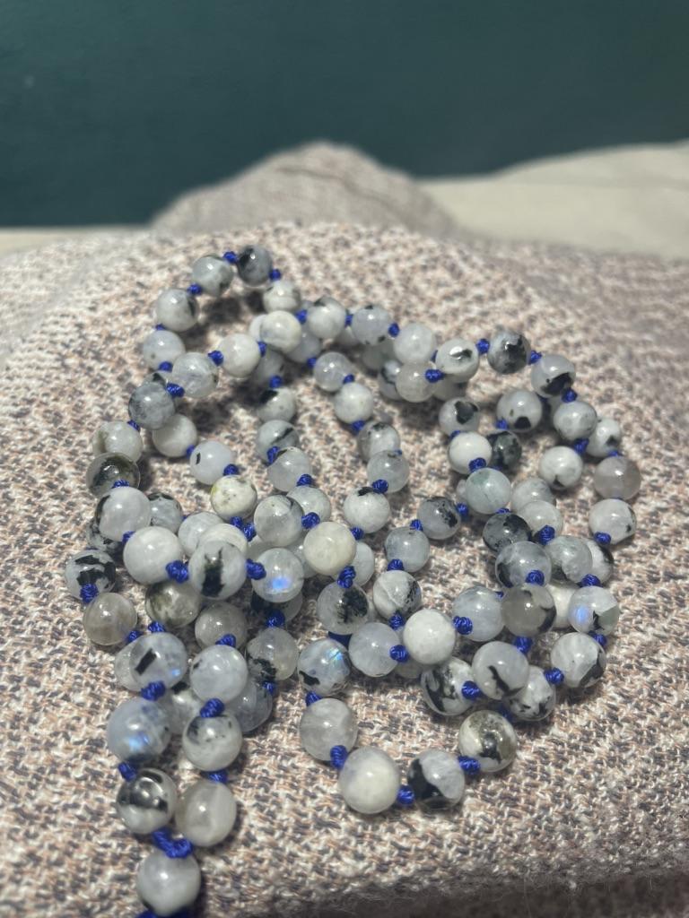 Natural Crystal Stone Rainbow Moonstone Mala Necklace Handmade Natural Healing Length: 66.04 cm Stone Size: 6 mm Shape Round Number of Beads 108 Authentic, Original, and Natural Healing with a Crystal Stone Mala for Reiki Healing, Crystal Healing, Numerology, Tarot, Astrology, and Feng Shui Small holes and crack marks on the surface or inside the stones are frequently visible in Stone Crystal Mala.
