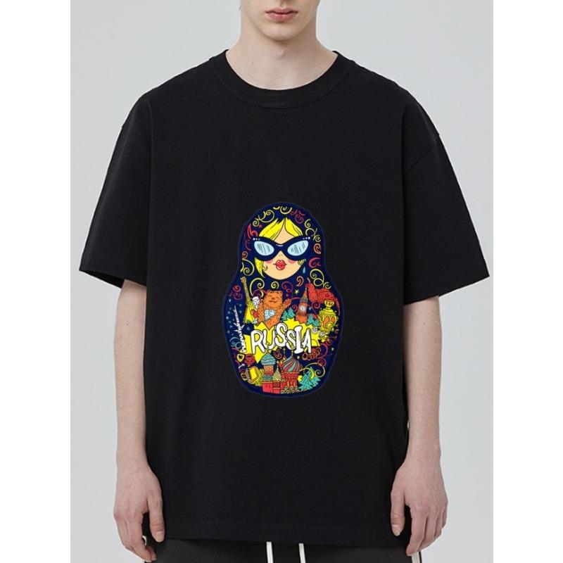 Unisex Oversized T Shirt Black Russia Matryoshka Doll with Sunglasses and Traditional Symbols Print Casual Streetwear for Daily Wear and Travel