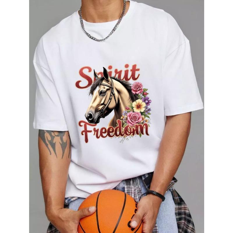 Spirit Freedom Horse Floral Print T Shirt White Casual Wear for Men and Women Outdoor Activities and Everyday Use