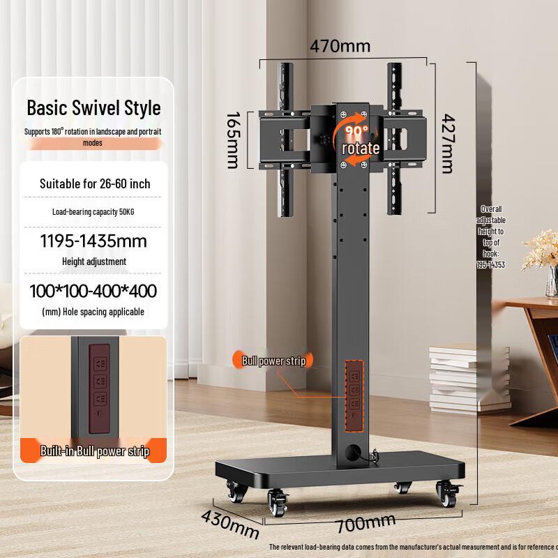 This versatile floor-standing mobile TV and monitor stand is designed for screens from 26 to 60 inches. Featuring smooth-rolling wheels for easy portability, a rotating mount for optimal viewing angles, and a storage-friendly design for organized cables, it's perfect for home entertainment, office presentations, or live broadcasting setups.