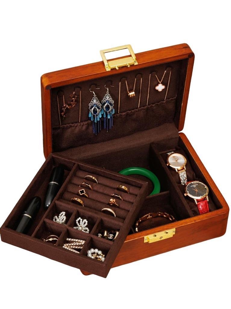 LIBOLXSP Olive Wood Two-Tier Jewelry Box with Lock, Storage Box for Travel, Mother's Day Gift (Dark Brown, 23 x 18 x 8.5 cm, Divided Storage) — buy online with free worldwide shipping!