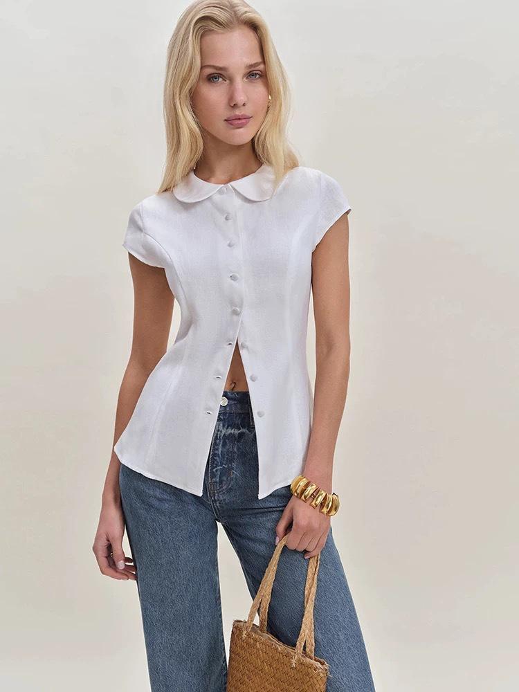 French Minimalist Linen Short-Sleeve Shirt with Elegant Doll Collar
