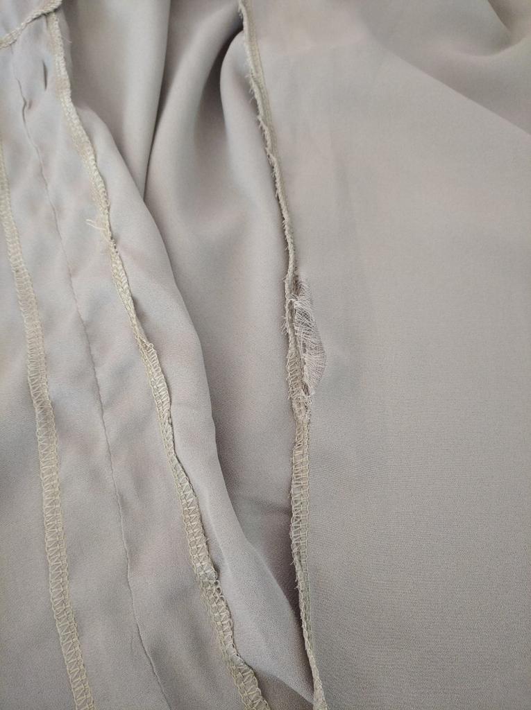 Hay un agujero en la manga que no está bien doblado; el overlocker tuvo que gastar dinero en un taller para dar un descuento por el dinero gastado en reparaciones.