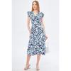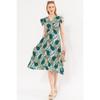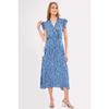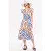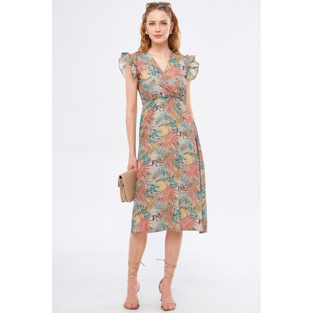 Vestido midi beige para mujer, cuello cruzado, volantes en los hombros, cintura elástica, largo midi, mangas 24y001020