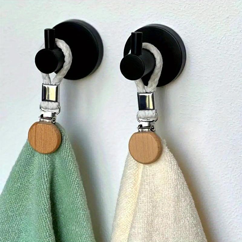 Clip multifuncional para toalla de cocina sin perforaciones, cuerda tejida, almacenamiento con cabeza redonda de madera de haya, clip para baño