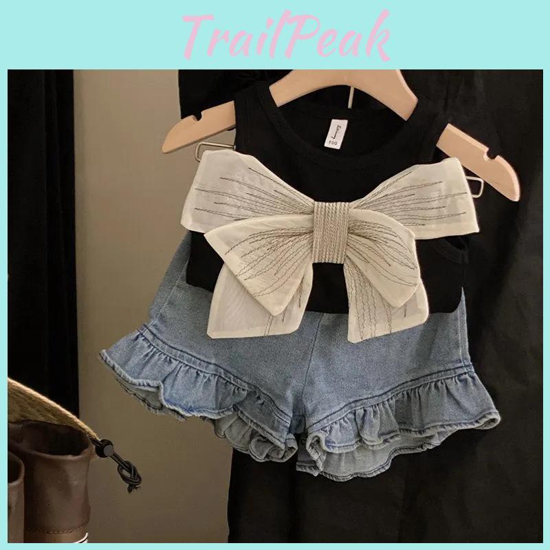 Stylish Summer Girl's Outfit Set Featuring Bow Tie Knit Vest And Frilled Denim Shorts