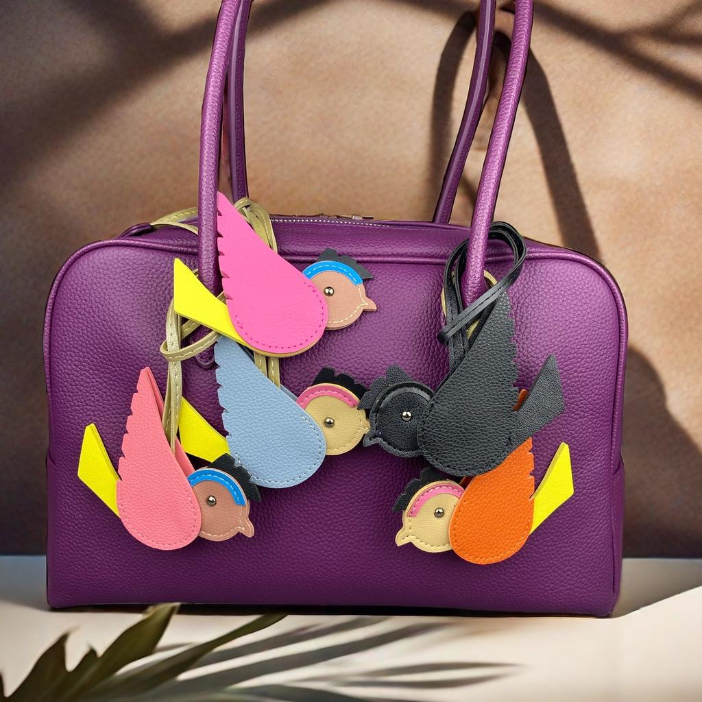 Cute Palm-Sized 3D Leather Bird Bag Charm - Colorful Stitched Leather Patchwork Pendant for Handbags with Vivid Bird Shape
