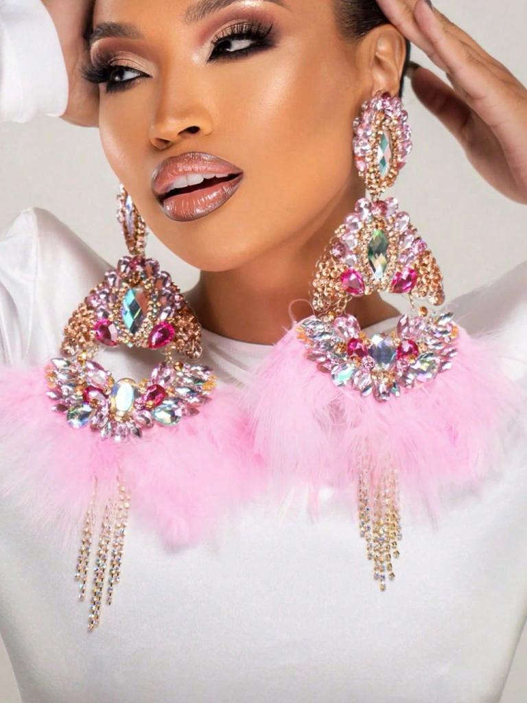 "1 pair Pink Feather Exaggerated Earrings with Tassel Pendant Women's Wedding Bohemian Jewelry Sparkling Big Water Diamond Earrin — compra barato en la tienda en línea Joom