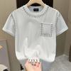 "Camiseta Blanca de Mujer con Cuello Redondo y Detalle de Remaches, Top Casual Holgado de Manga Corta con Bolsillo — compra barato en la tienda en línea Joom