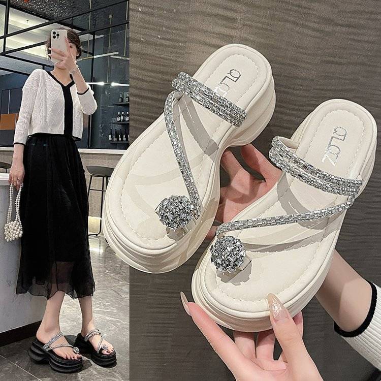 Fashion versatile height-increasing muffin fairy style sandals female 2025 summer new wear rhinestone sleeves toe slippers — ostke Joom e-poes odavalt