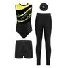 4-Piece Girls Gymnastics Dance Set Sleeveless Color Block Leotard with Rhinestone Shorts Leggings Hair Band