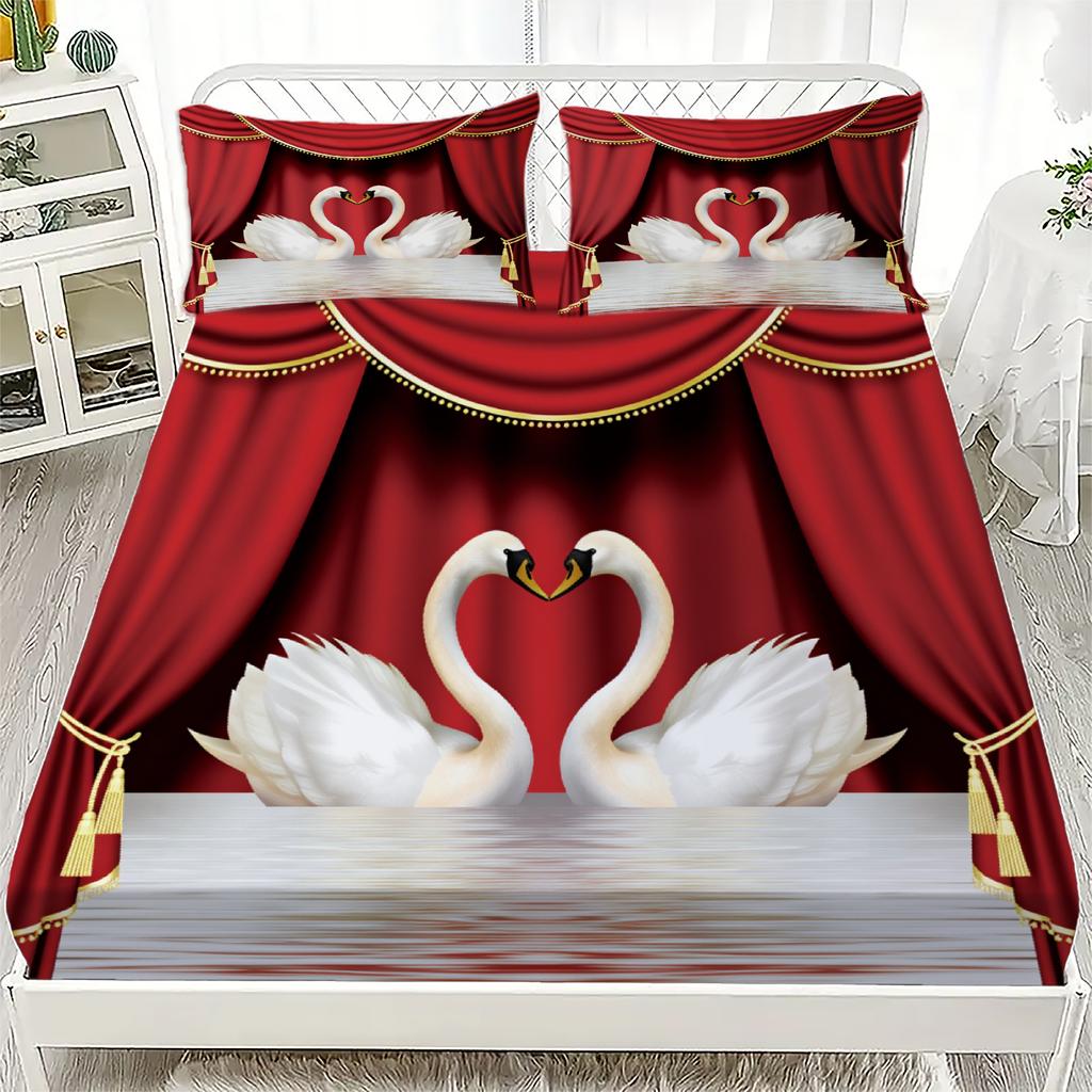 3pcs White Red Fitted Sheet 3D Printed Romantic Swan Couple For Couples Gifts Flat Sheet With 2 Pillowcases Bedroom Decor