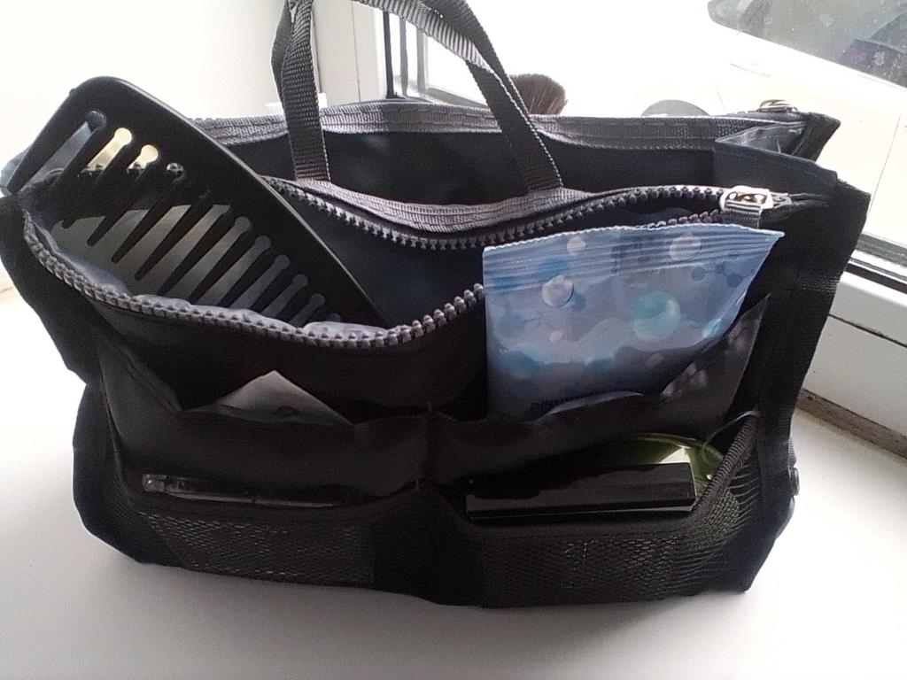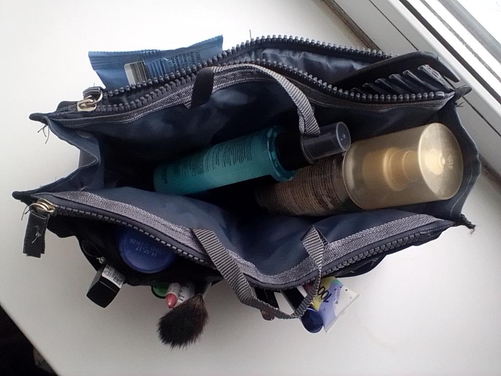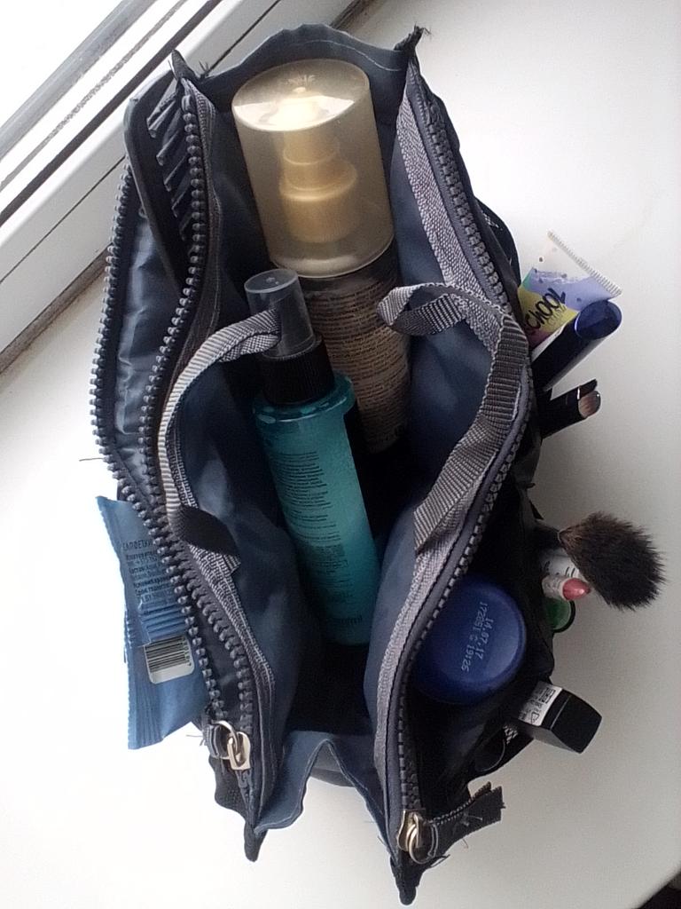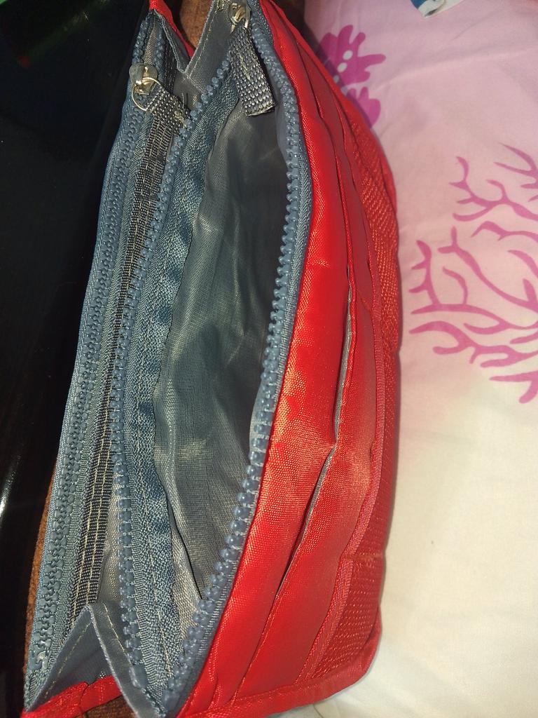 Ottimo per i viaggi, due tasche con cerniera, uno scomparto aperto al centro, come un kit di pronto soccorso o cosmetici per bottiglie, lo consiglio