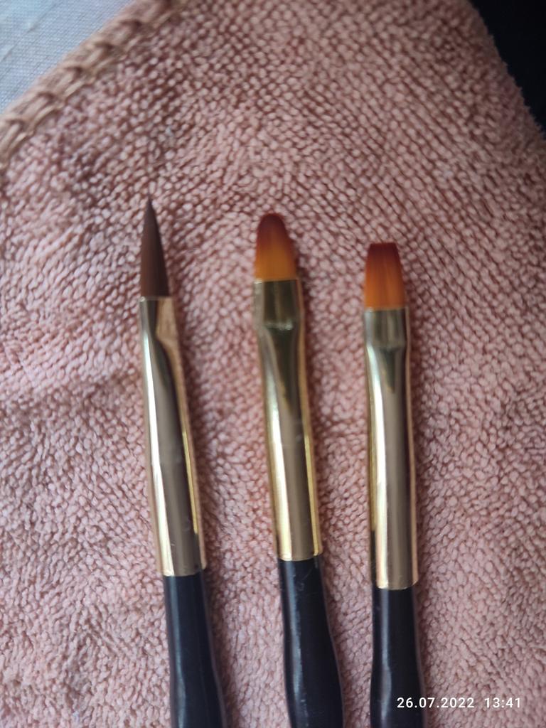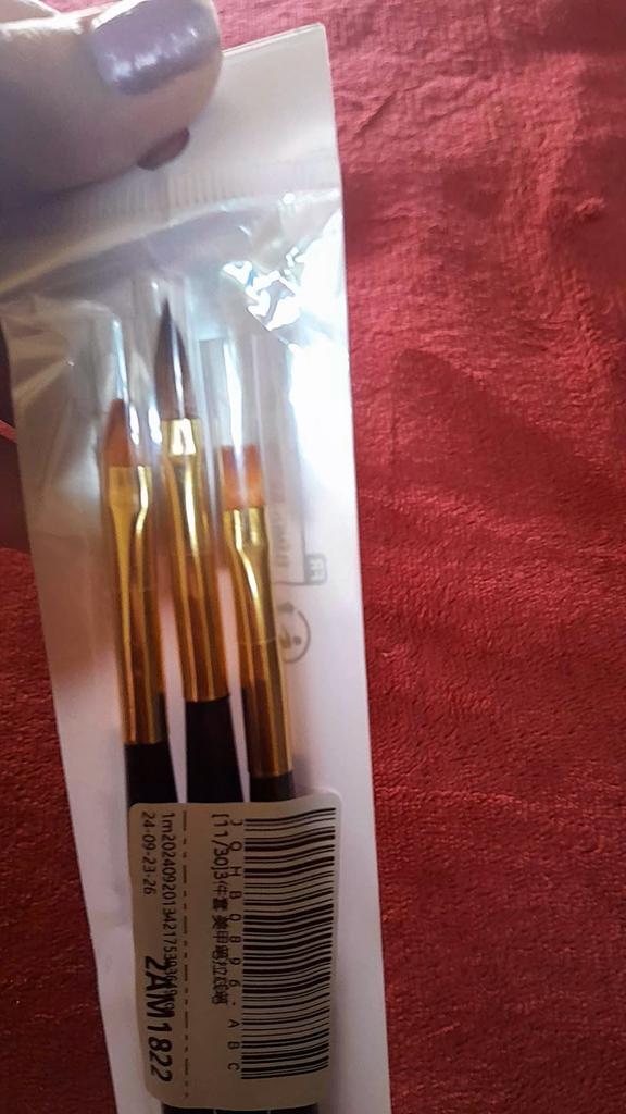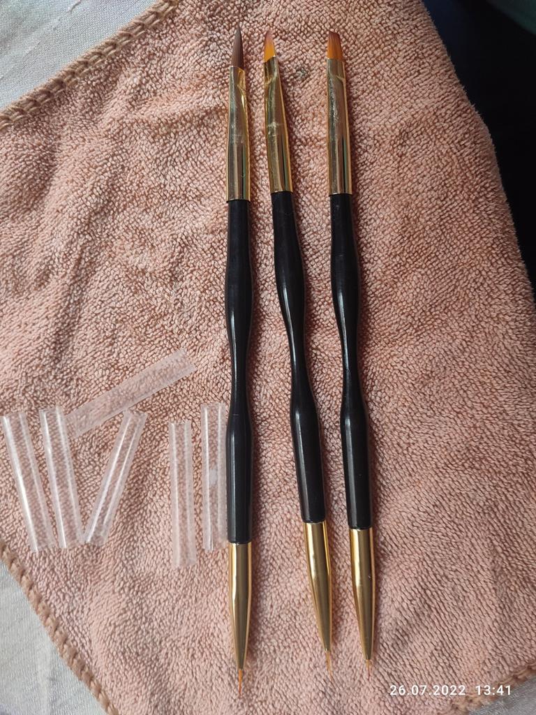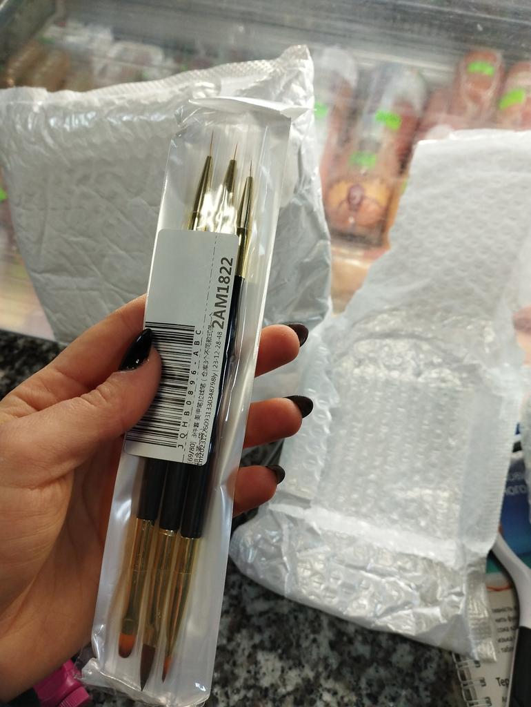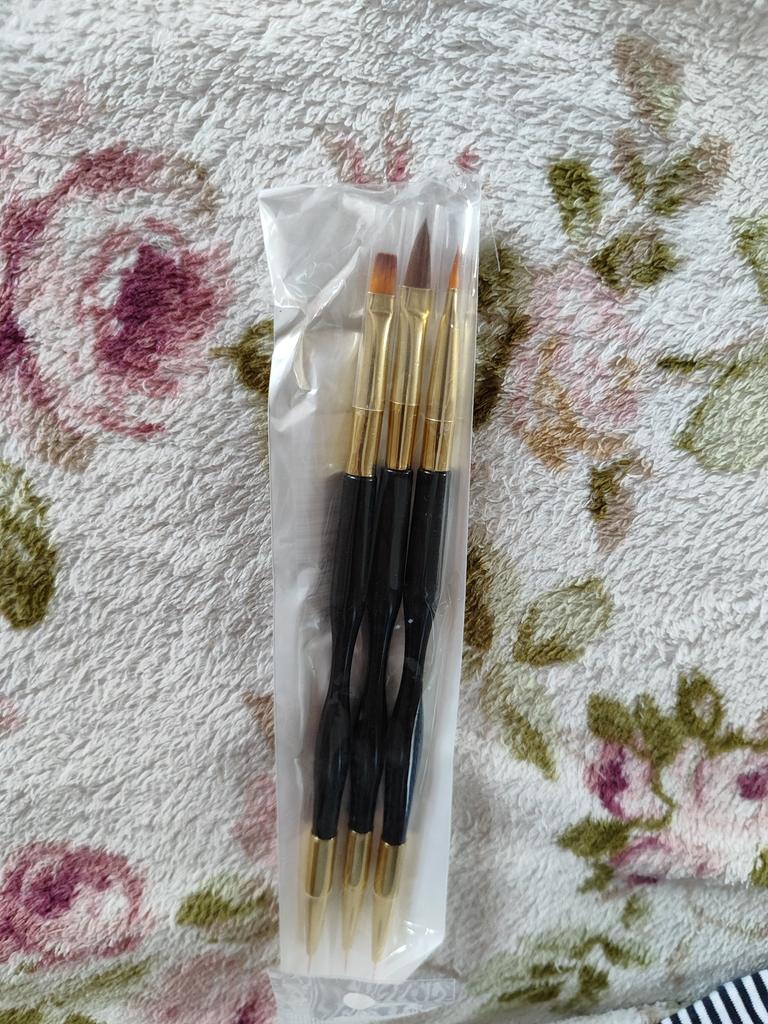 I pennelli sono arrivati in circa tre settimane. Il set include 3 pennelli a doppia faccia. Da un lato troviamo pennelli super sottili e precisi, di diverse lunghezze per decorazioni o pittura sotto le cuticole, dall'altro pennelli ideali per gel/acrilico/gel arilico. Grazie alla profilatura, sono comodi da tenere in mano.