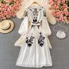 RUGOD Abito lungo da viaggio in stile etnico con ricamo girocollo con maniche a lanterna, abito stile bohémien retrò ampio scampanato femminile
