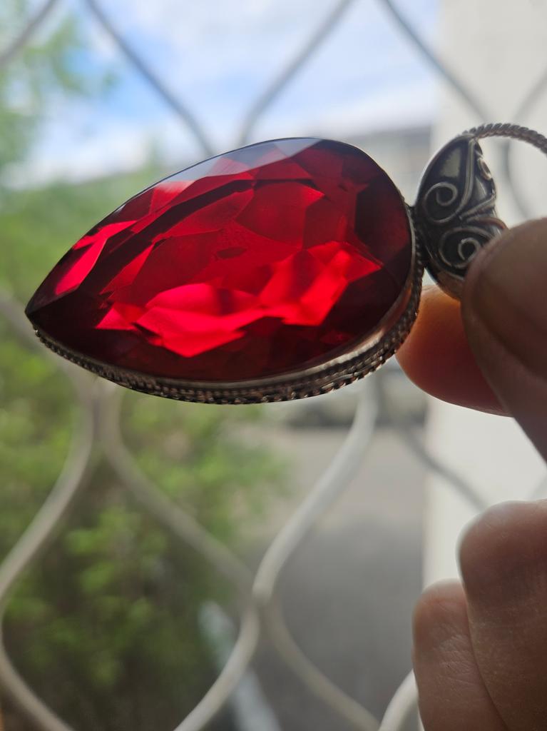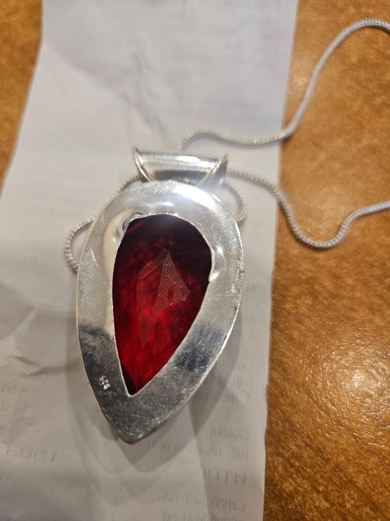 Delusione: colore, forma non corrispondono. Il colore è rosso, non granato, la forma è allungata. Il vetro non è levigato in alcuni punti. Con l'argento dovrò ancora sistemare.
