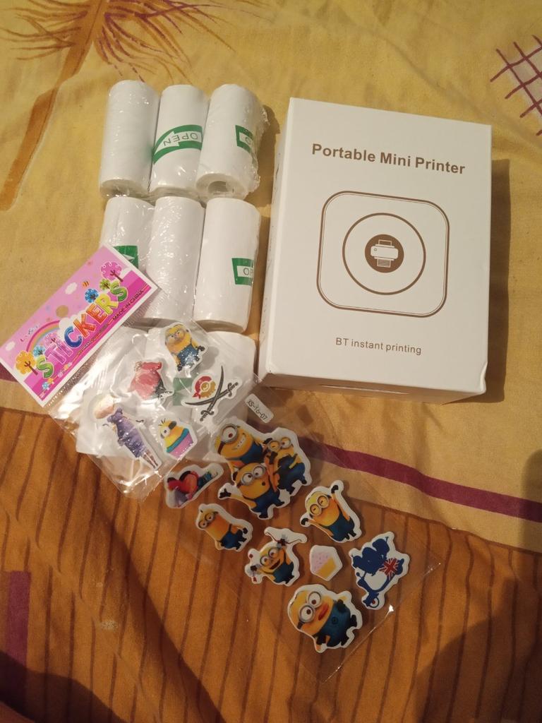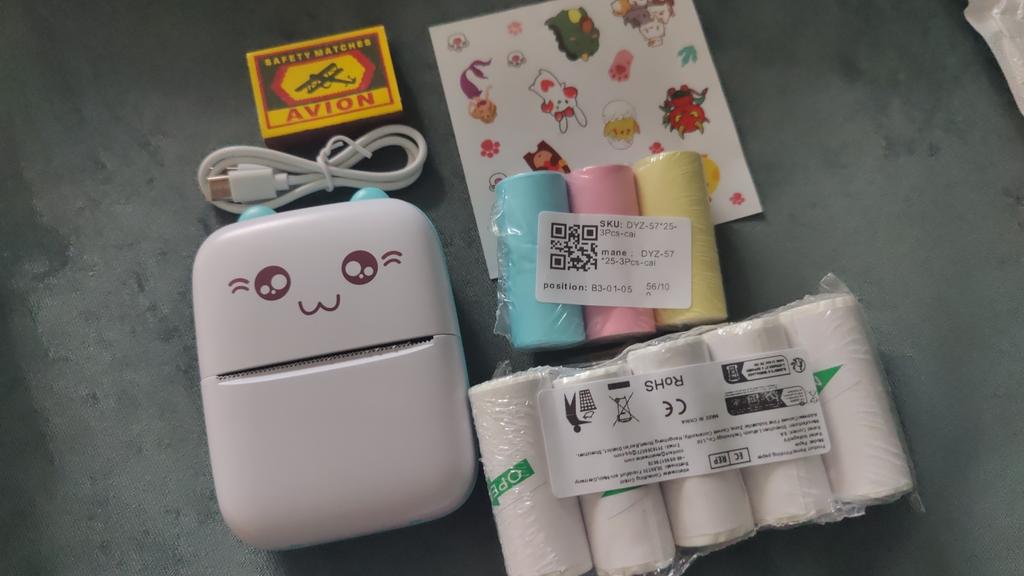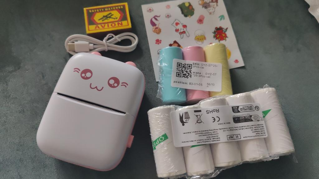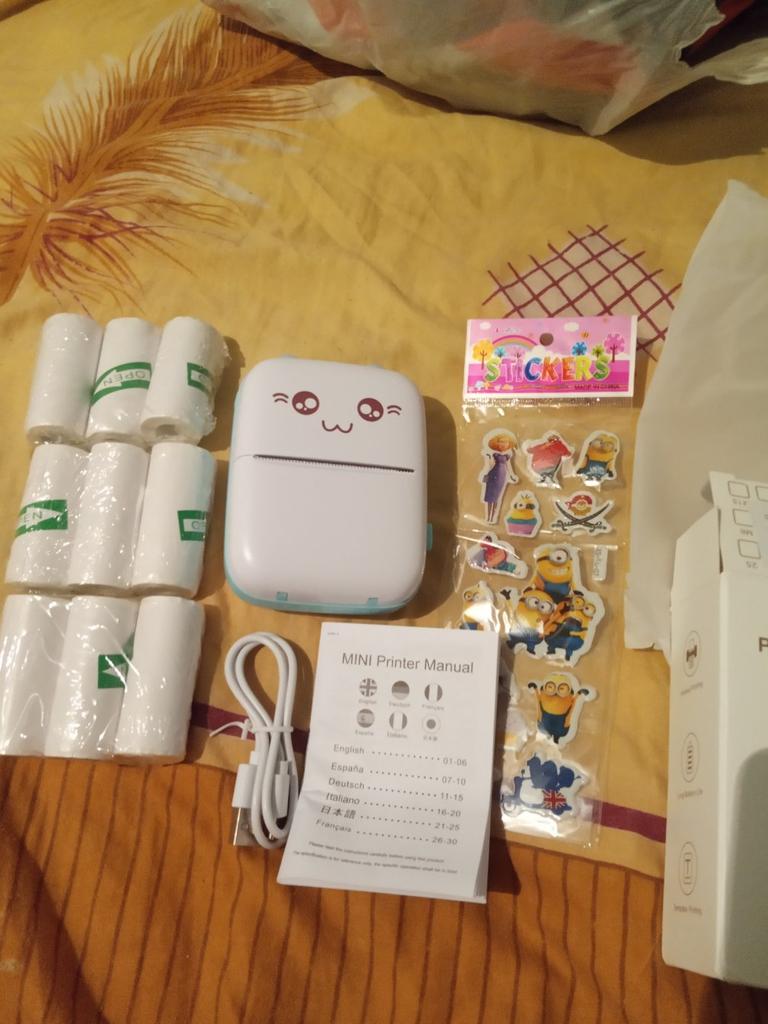 All'interno è presente un manuale in inglese su come utilizzare il dispositivo e le istruzioni su come inserire correttamente la carta. C'è anche un codice QR per scaricare l'app. Basta scansionare, scaricare, installare. Un grande vantaggio dell'applicazione è che attiva automaticamente la lingua dell'interfaccia del telefono. Pertanto, tutto è immediatamente chiaro) La qualità di stampa è normale. Il testo viene stampato meglio, la foto è un po' peggio (sfocata). Bene, questo è previsto in linea di principio))) All'interno c'è un rotolo di carta. È incluso anche un cavo Type-C, senza caricabatterie (tienilo presente). La stampante viene collegata al telefono una volta. La prossima volta sarà sufficiente accendere la stampante, accedere all'applicazione e stampare (il dispositivo viene salvato). Si connette molto rapidamente. Gli adesivi sono stati aggiunti come regalo.