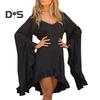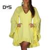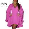Mini abito da donna a maniche lunghe svasato con scollo a V, tinta unita, orlo irregolare con volant, abito corto casual da vacanza in tinta unita