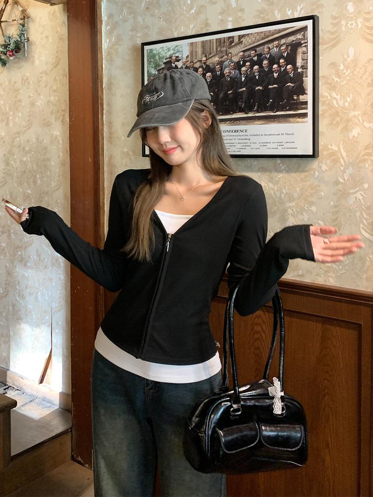 Fake two-piece black and white contrasting German velvet thickened warm slim bottoming women's autumn and winter new long-sleeved inner zipper top