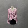 French Romantic Purple V-Neck Pleated Waist Retro Top with Long Sleeves