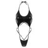 Womens Metallic Halter Neck Jumpsuit Open Back Design Hip Straps Lingerie Set with G-String