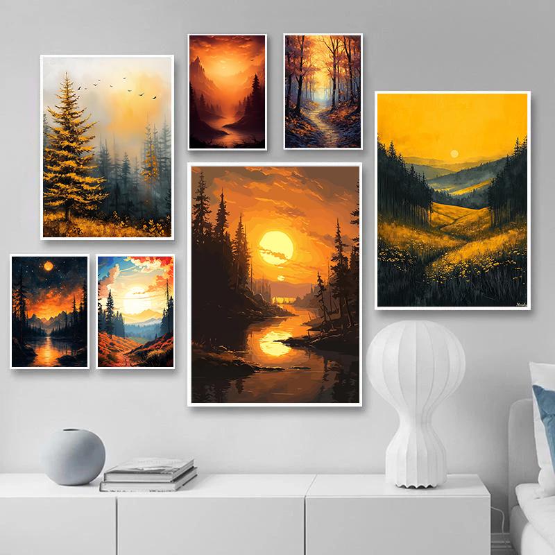 Retro Warm Forest Valley Sunset Natural Wilderness Landscape Art Poster Canvas Prints Mural Living Room Bedroom Home Decoration