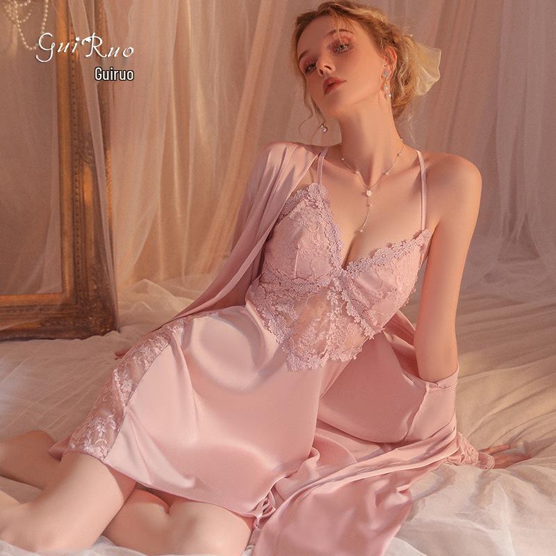 Satin Backless Lace Nightgown with Padded Deep V & Tie-Waist Robe Set