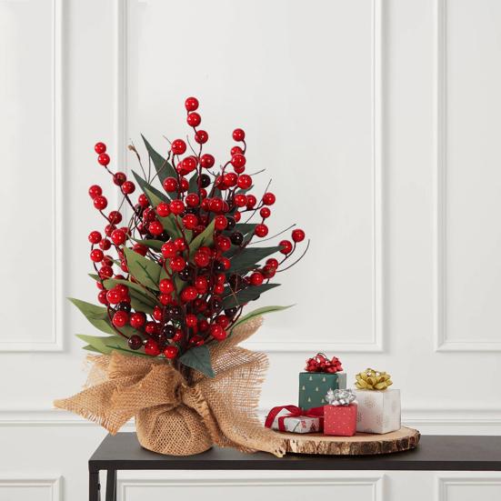 Abbraccia lo spirito festivo con il suo design a tema natalizio caratterizzato da bacche rosse, aghi di pino verdi, pigne bianco neve e accenti argentati.. Perfetta per le decorazioni natalizie o per l'esposizione durante tutto l'anno, questa pianta emana un fascino caldo e naturale.. Confezionato in iuta rustica con un fiocco per un tocco in più di stile country, è una deliziosa aggiunta al tuo soggiorno, tavolo da pranzo, davanzale o come affascinante decorazione regalo.