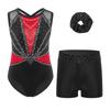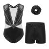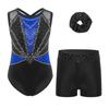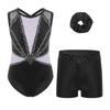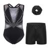 Girls Dance Gymnastics Outfit Sleeveless Crisscross Back Shiny Rhinestones Color Block Metallic Leotard Elastic Waistband Short