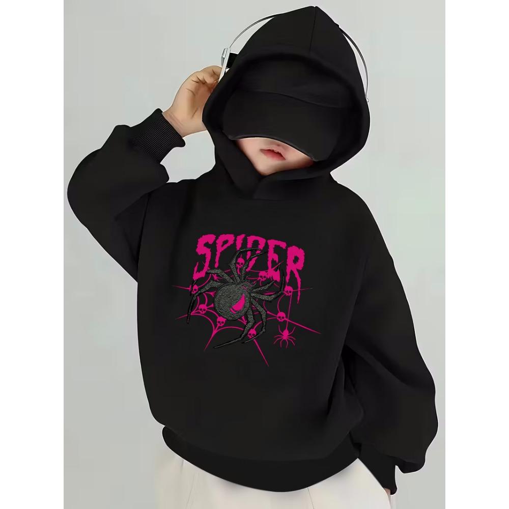 Black And Pink Contrasting Spider Print Casual And Trendy Children's Hooded Sweatshirt