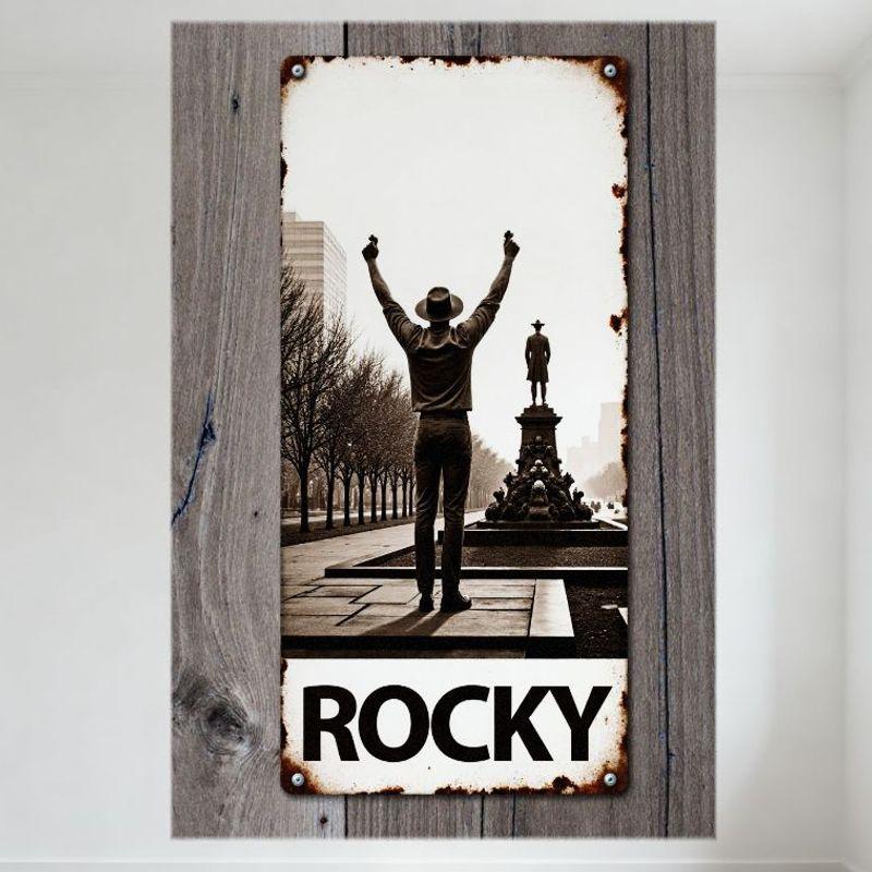 Vintage Metal Tin Sign Rocky Statue Man Cave Bar Home Decor Rustic Weathered Rusted Frame Urban Background Black & White Photo W