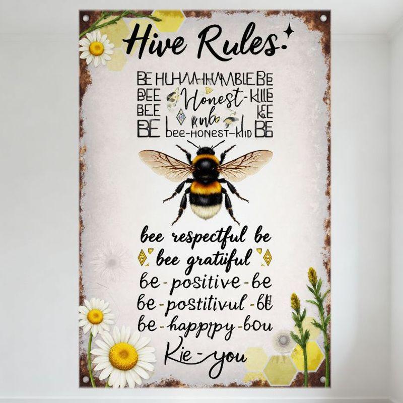 Hive Rules Bee Themed Metal Tin Sign Vintage Rustic Life Rules with Be Humble Honest Kind Positive Happy Decor for Home Cafe Bar