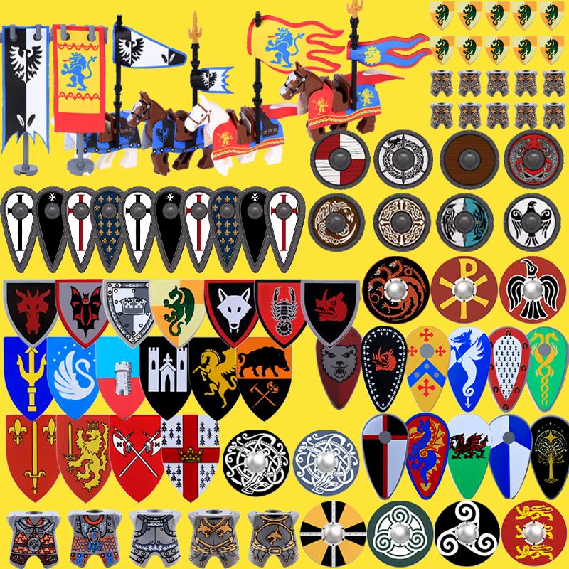 MOC Medieval Military Castle Weapon Roman Knight Helmet Shield Accessories Building Blocks Green Dragon Lion Crusader Bricks Toy