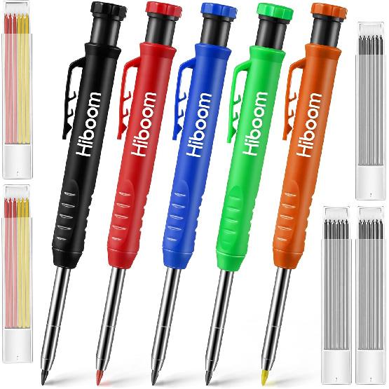 Hiboom 5 Pcs Mechanical Carpenter Pencil, 30 Pcs Refills Needle Nose Tip Hole Marker with Built in Sharpener, Scribe Making Tools for Woodworking,