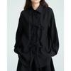 Camicia da donna nera testurizzata, casual, ampia, a maniche lunghe, con nodo sul davanti e bottoni.