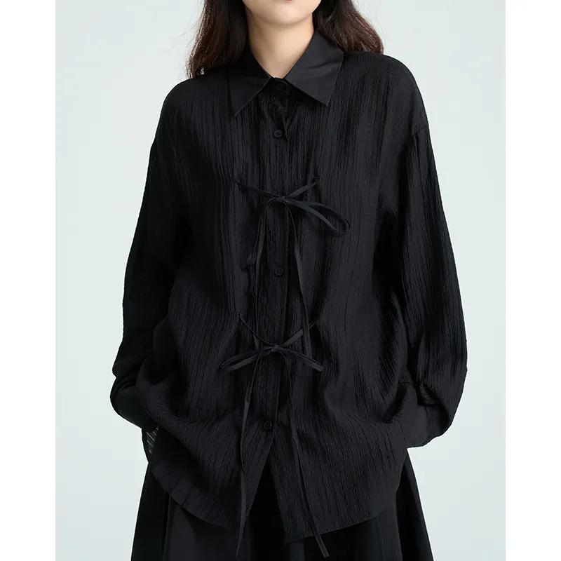 Women's Black Textured Shirt Casual Loose Long Sleeve Tie Front Button-Down Blouse — acquista al miglior prezzo sul negozio online Joom