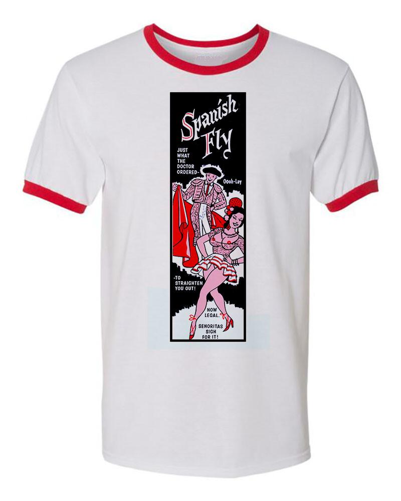 Unisex Ringer Tee T-shirt Cotton Novelty 70s Funny Condom Retro Spanish Fly Unisex T-Shirt — acquista un prodotto online con la spedizione gratuita in tutto il mondo!