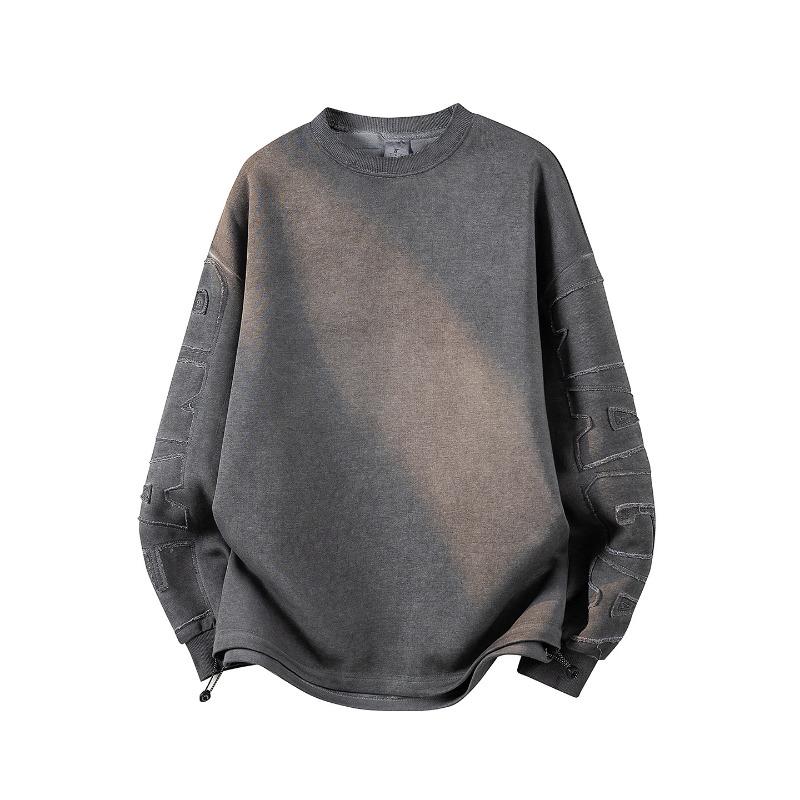 Men's Embossed Sleeve Crew Neck Sweatshirt, Gradient Wash Casual Pullover with Drawstring Hem, Oversized Streetwear Top for Spring & Autumn