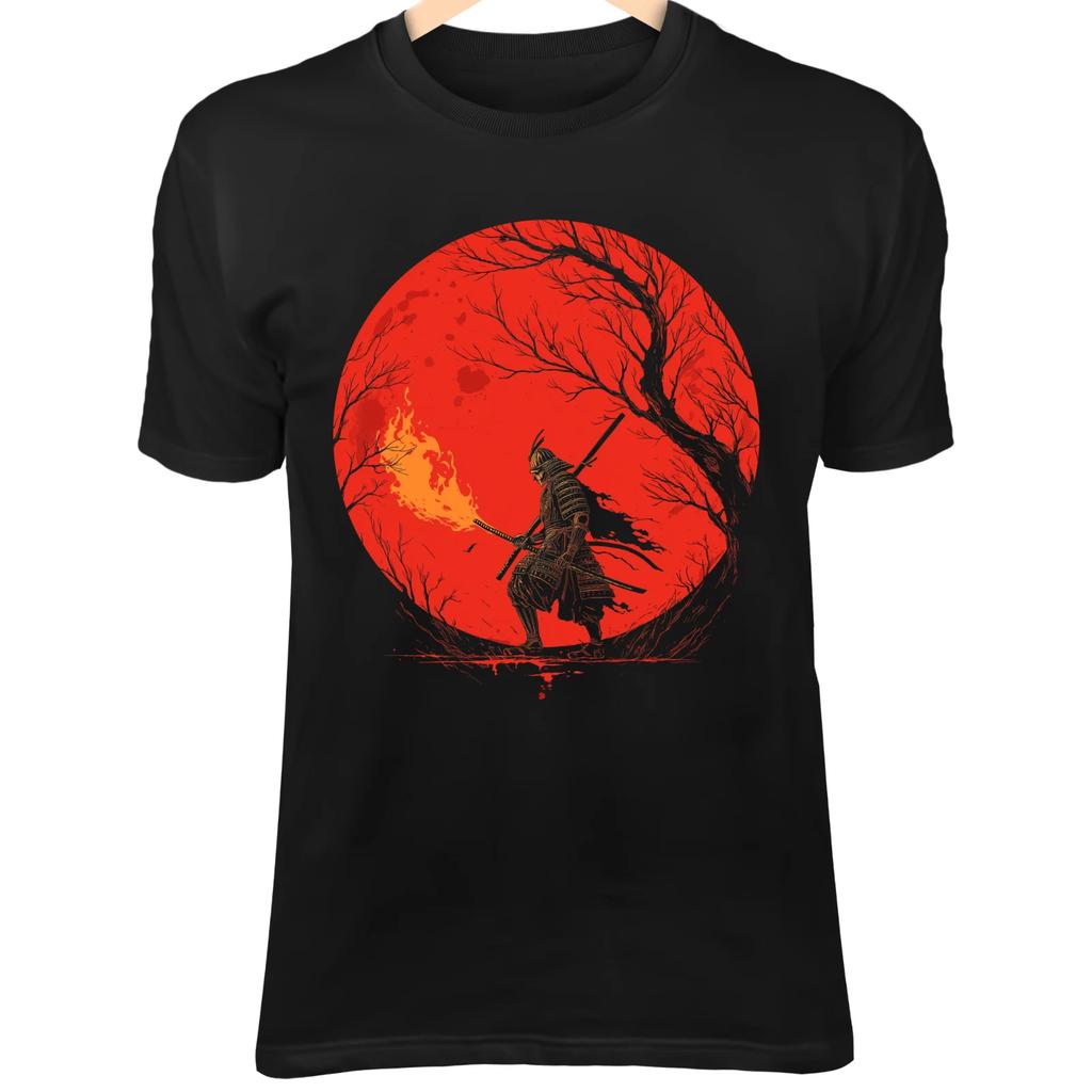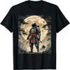 Samurai Skull T-Shirt – Flaming Katana, Full Moon, Wind-Blown Cloak Art