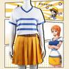 The first outfit is Nami’s iconic pre-timeskip look, a fan-favorite design that perfectly captures her sharp, adventurous spirit. The set includes a white short-sleeved top with two bold blue horizontal stripes, a V-neck collar with blue trim, and a vibrant orange pleated A-line skirt. The outfit is finished with a wide brown leather belt, adorned with a large silver square buckle—an exact replica of Nami’s signature waist accessory that defines her silhouette. The pleated skirt is crafted with crisp, well-defined folds that hold their shape all day, while the lightweight top fabric ensures breathability and comfort. Every stitch and color is matched to the original artwork, so you’ll look exactly like the Straw Hat crew’s brilliant navigator, both in person and in photos.
