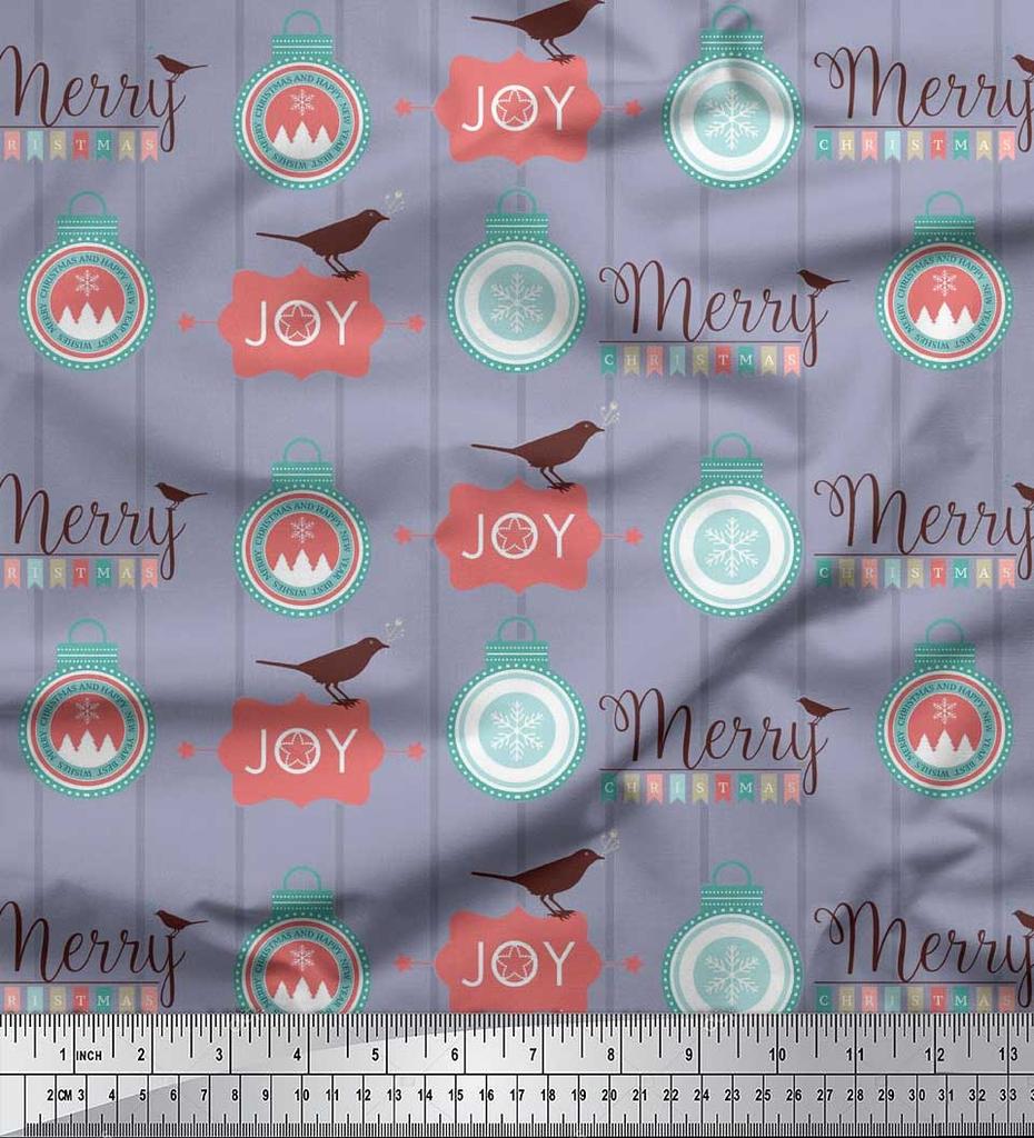 Soimoi Grey Japan Crepe Satin Fabric Bird,Stripe & Baubles Christmas Print Fabric by the metre 42 Inch