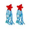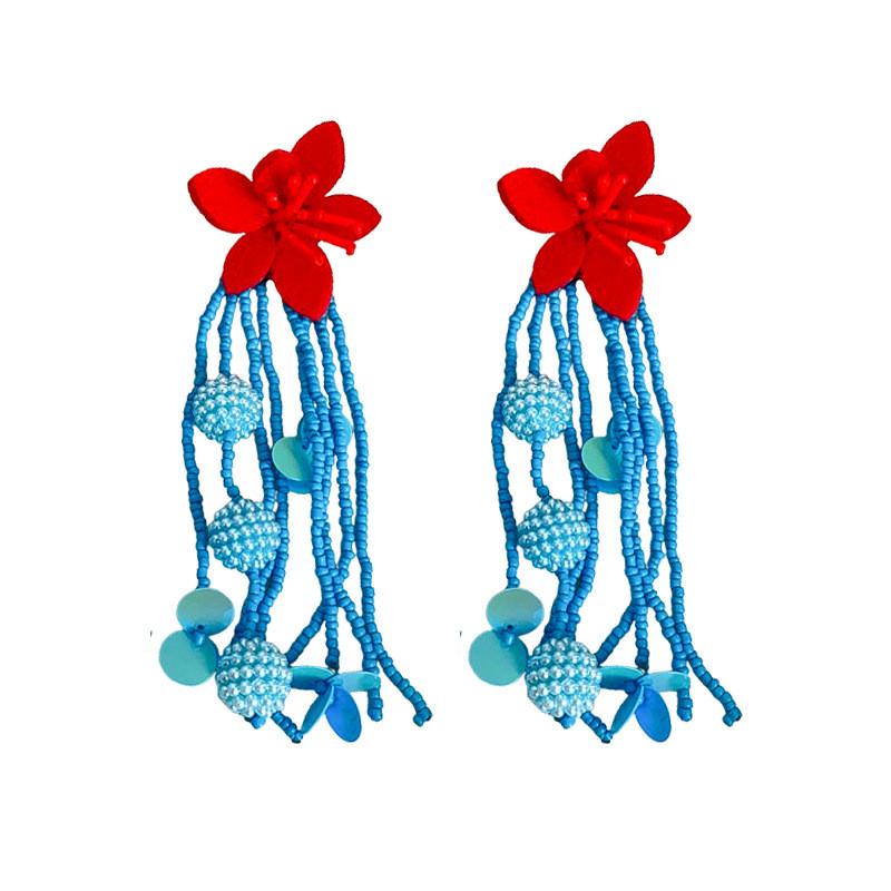 These vintage-inspired long tassel earrings feature bold red floral designs crafted from durable alloy, measuring approximately 3 inches in length. The handcrafted jewelry showcases colorful beads and a steel post for secure wear. Ideal for holiday or summer events, these earrings add a unique, artistic touch to any outfit. Wipe clean with a soft cloth for maintenance.