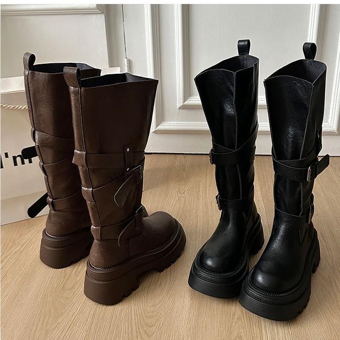 [Fanfna] Maillard brown boots women's big tube circumference thick-soled heightening western cowboy tall knight boots