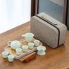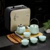 Jade Green Travel Tea Set: One Pot, Four Cups, with Wooden Side Handle and Tea Caddy.
