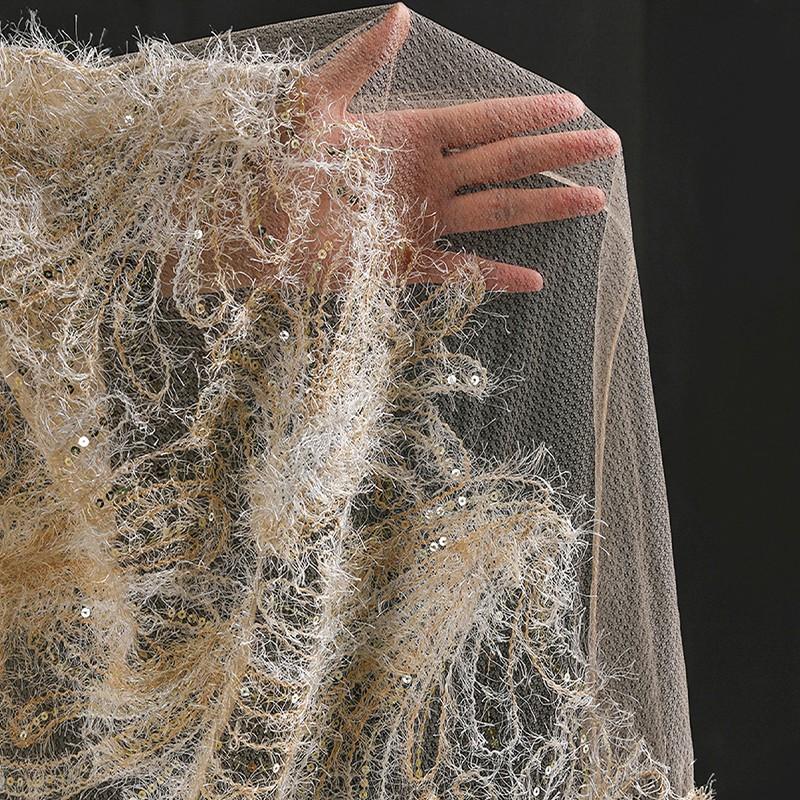 Beads Feather Fringe Sequins Mesh Fabric Texture Mesh Lace Dress Designer Fabric Gauze Material DIY Wedding Dress Craft Clothing