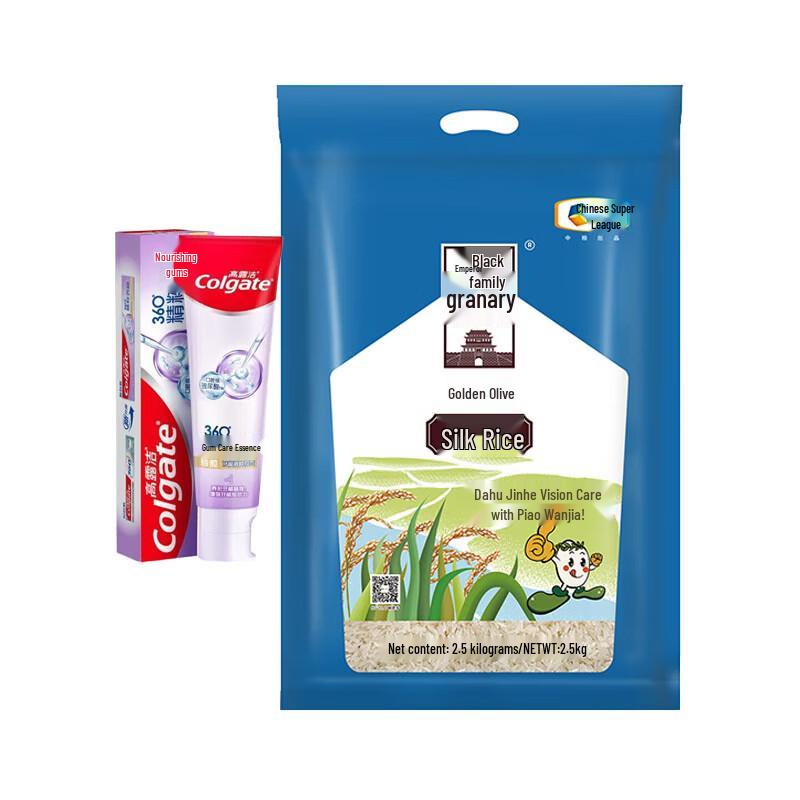 This bundle features Colgate 360 Gum Care Toothpaste (120g), formulated for healthy gums and basic cleaning with fluoride, alongside a 2.5kg bag of Royal Granary Golden Olive Scented Rice. The toothpaste is produced in Anhui, China, has a 3-year shelf life, and is a non-special cosmetic product.